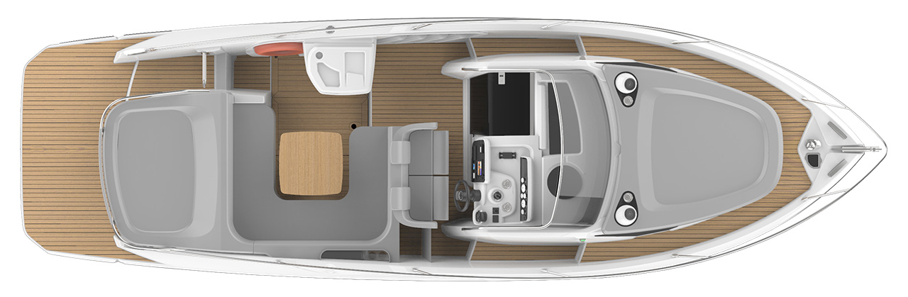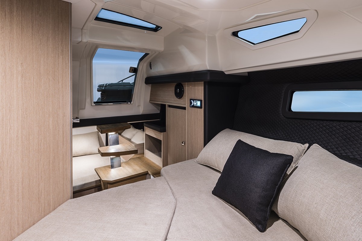 The sun decks on either side of the boat have also been redesigned, and made more comfortable, also thanks to the added cup holders and integrated loudspeakers. The table used for the large C-shaped sofa in the cockpit can be lowered thanks to an hydraulic servomechanism, to transform the seating area into another sun deck which is protected from the edges to make it extra safe, especially for children.