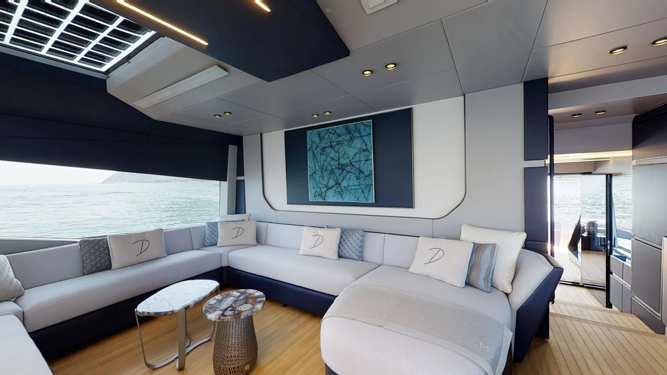 The fly deck spans over a surface of 40 square meters with a new position for the second control station, a large sunbathing area, an 8 seater dining table, and a wet bar to fully enjoy from a high position long and relaxing moments or convivial dinners at anchor in a beautiful bay. The layout design stems from the desire to ensure maximum liveability everywhere on board: an example being the exceptional beach club of over 50 square meters providing guests with the pleasure of living a unique experience in direct contact with the sea. The exterior layout of the main deck spreads over three levels facing the sea, starting from the outdoor dining area which, thanks to a large and bright window with an automatic up/down system, allows a direct connection with the kitchen area, in perfect harmony with the core value of the outdoor living space aimed at creating conviviality and socialization, a relaxing area with a large sofa and a sizeable sunbathing area at the outer end of the stern in direct communication with the swim platform which allows, through an up/down lifting system, to enjoy a private swimming pool straight into the sea. A modern and innovative design to offer guests a magical seascape. On the lower deck, 8 guests find luxurious accommodation in four large double cabins all with en-suite bathrooms including the full-beam owner’s cabin amidships. The crew quarter with separate access to the saloon comprises a crew mess and two double cabins with private bathrooms. Design, engineering, and quality for cruising in harmony with nature and respectful of the environment thanks to reduced consumption and green energy produced by the solar panels incorporated in the glass surfaces of the salon. Our life-changing experience on board “The New CrosSeaOver Yachting Experience