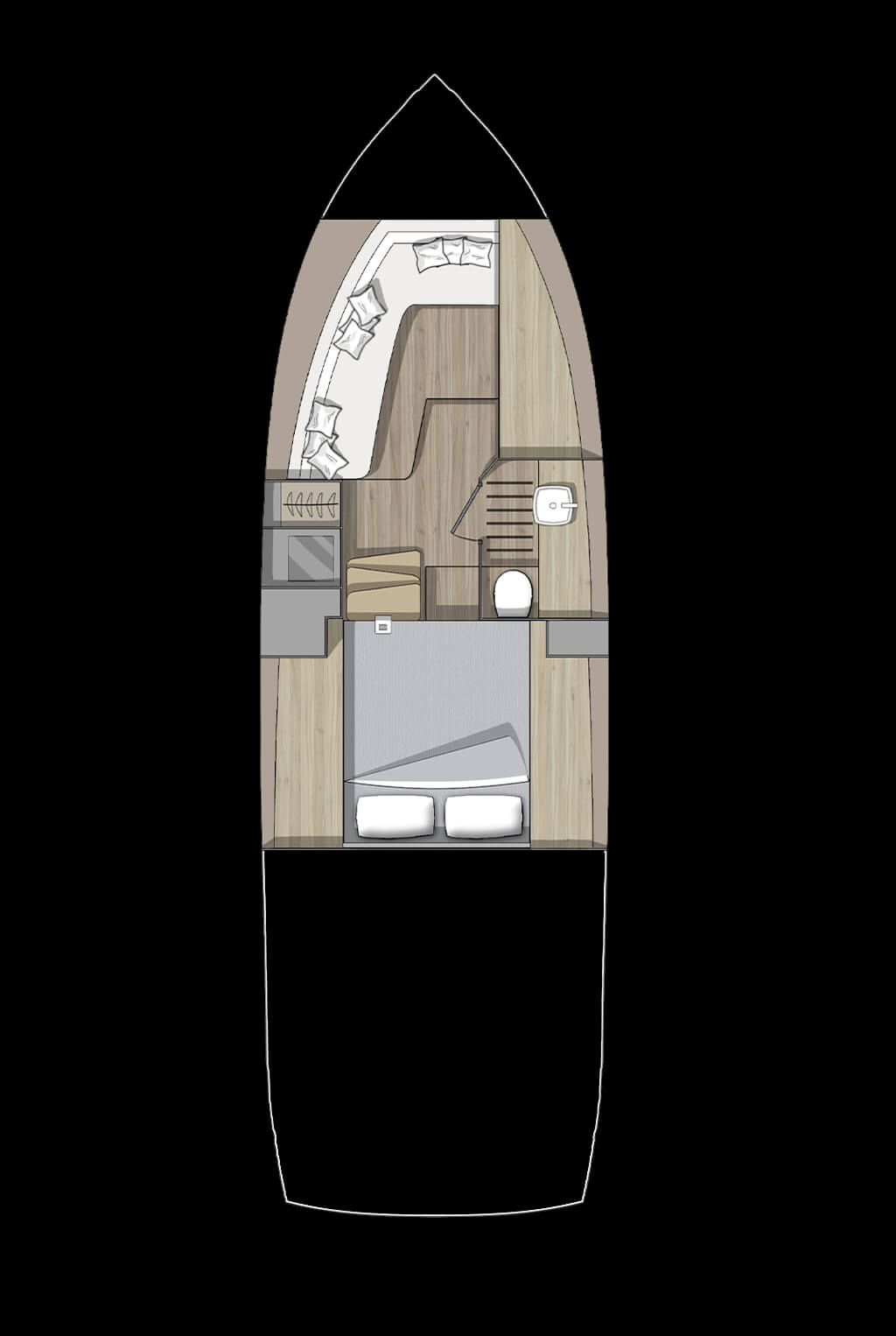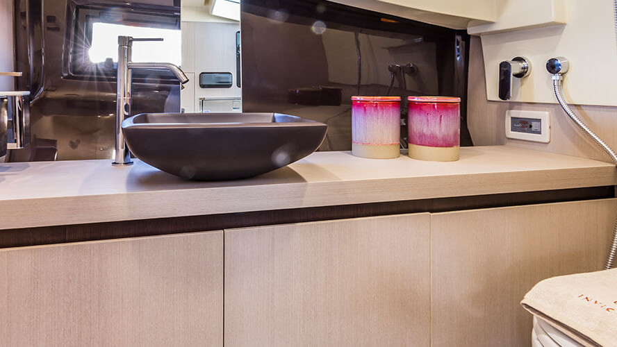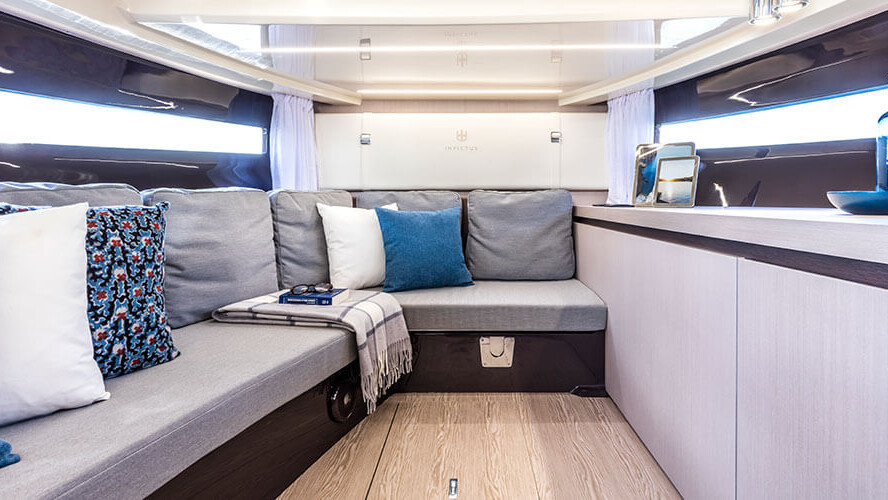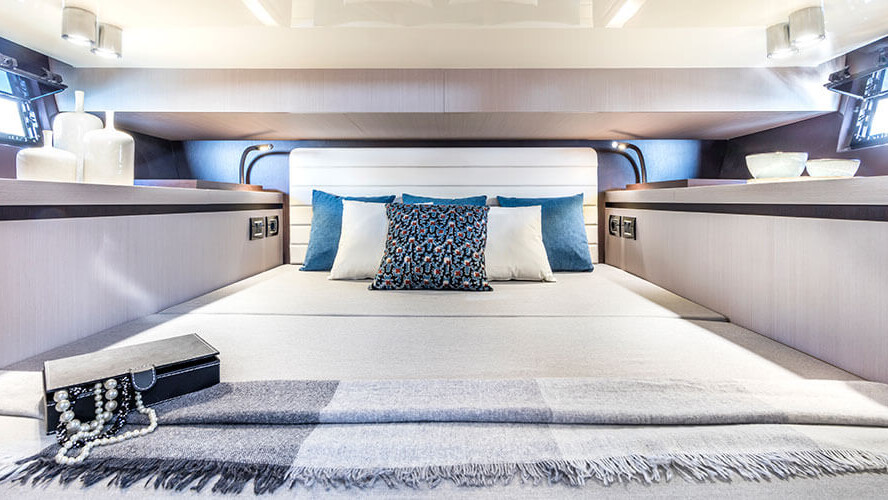 The perfect blending of materials, f inishings and furniture embodies the dream for a navigable object ideal for long stays on board in contact with nature, in pursuit of those values that def ine the emotion evoked by sharing moments and gestures with our loved ones.