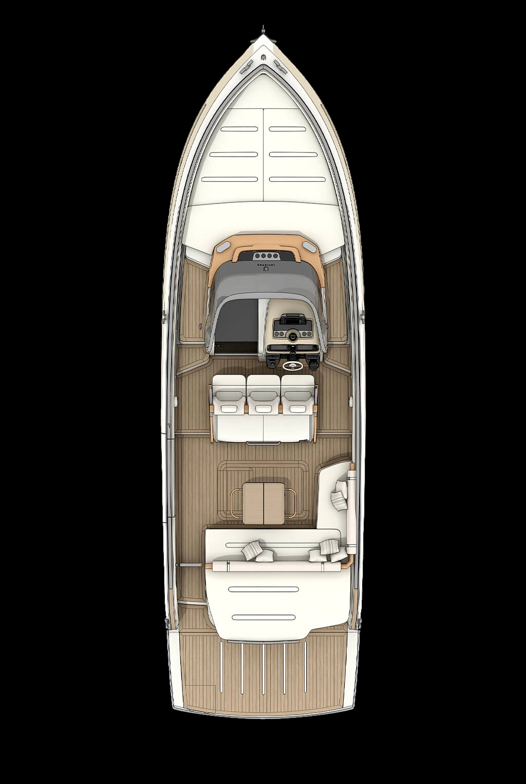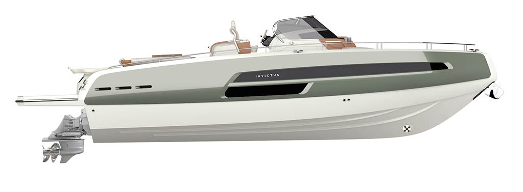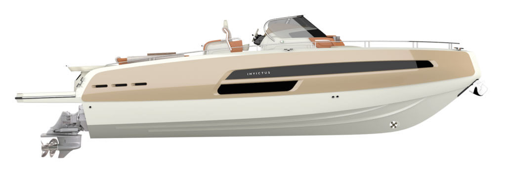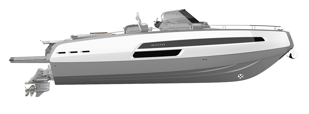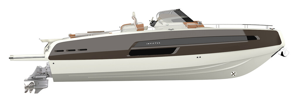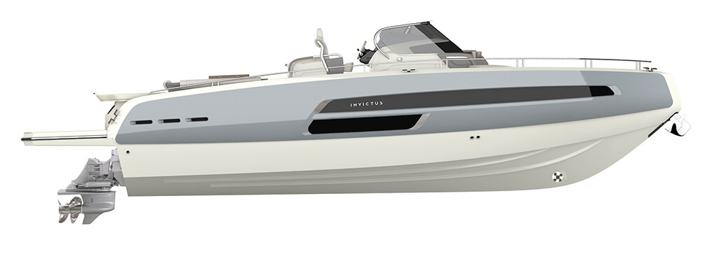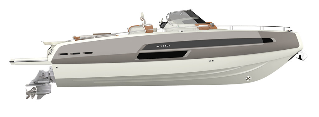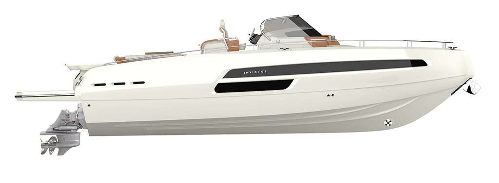 Invictus GT370, luxury evolution doesn’t stop. With this model new frontiers of beauty and elegance have been reached. The distinctive element of this hull, carved in the material nearly as natural elements made it, is the GT typical “half reverse”bow. Here refinement and power reach the best balance. GT370 is the peak of luxury and style, customizable with unique elements for a boat of this size, like the opening side converting into a waterfront terrace, the hydraulic platform and a long list of selectable details, made even larger through the Invictus Atelier experience. The continuous windows on the sides open towards a great area, made to enhance the exclusivity of a cruise.