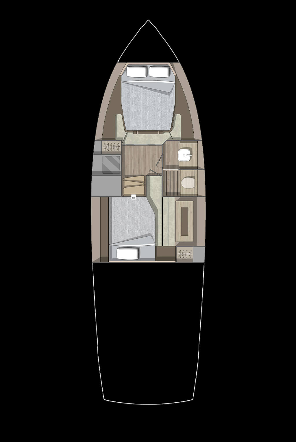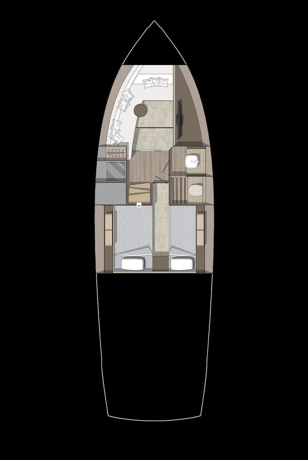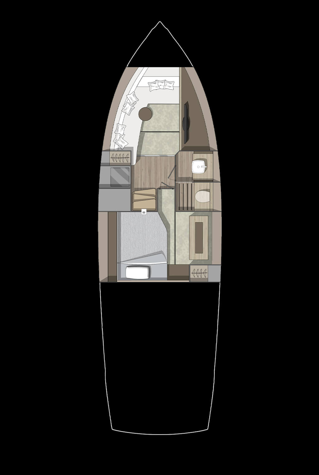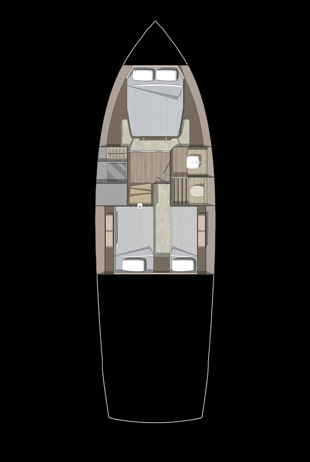 The perfect blending of materials, f inishings and furniture embodies the dream for a navigable object ideal for long stays on board in contact with nature, in pursuit of those values that def ine the emotion evoked by sharing moments and gestures with our loved ones.