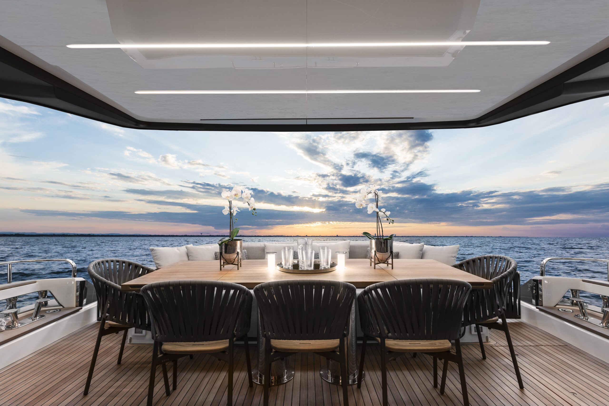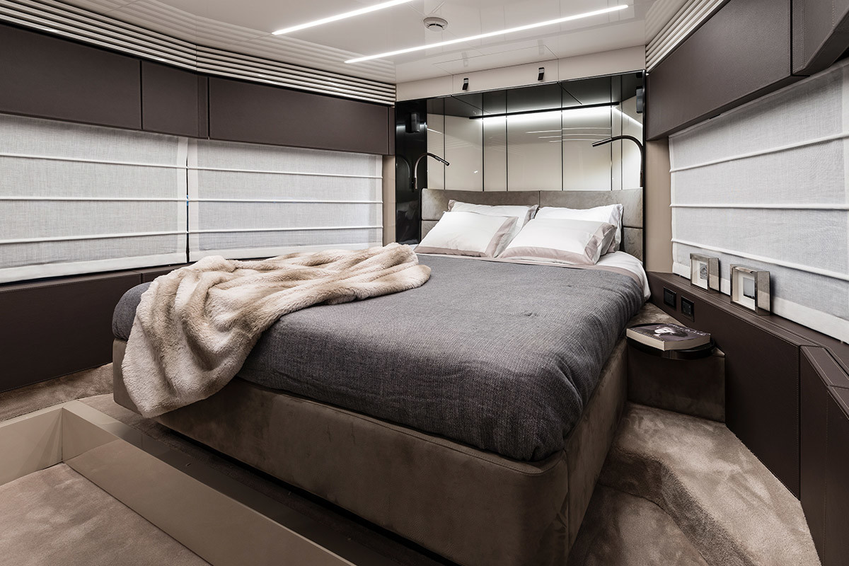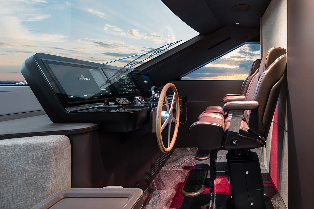 With the art direction of Christian Grande, Cranchi Yachts has created a new interior design proposal for the Settantotto. The Firenze decor is a tribute to Italian genius and taste, with a noble and sophisticated palette of colors and materials. Warm and refined tones that convey a feeling of relaxed elegance, with an alternation of glossy and matte surfaces that enhance volumes and geometries.